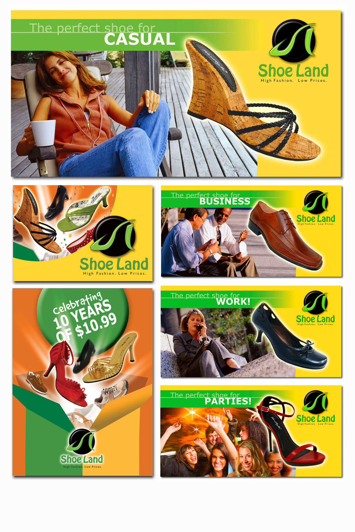 Our creative graphic design work for this client included a brand new logo, which features a freestyle, bright green "SL" cleverly designed in the shape of a shoe, resting on a stylish black disc. From there we went vertical with a cohesive family of interior retail posters featuring "the perfect shoe" for parties, business, and casual. Next we created exterior branding for the stores; focusing on value, styles and selection. KPCS also created a wide variety of retail signage and event posters, all designed to reinforce the high fashion/low price promise.
