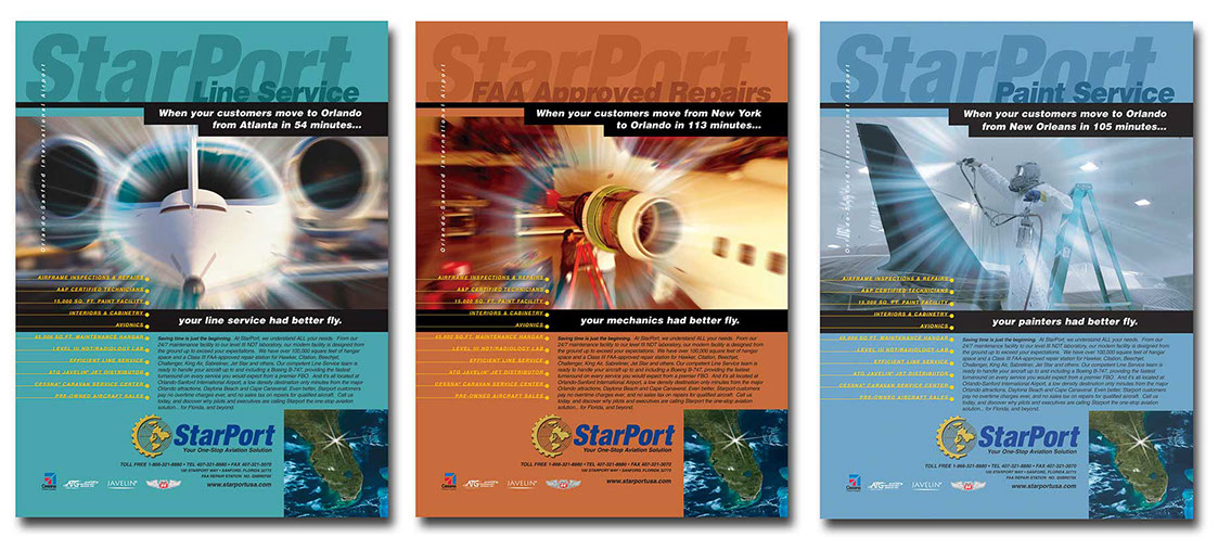 Our creative graphic design work for this client included an International ad campaign, informing its technically advanced target market of pilots and aircraft industry personnel that StarPort USA was now providing a full range of aircraft services and Class III FAA-approved repairs from a 100,000 sq ft. facility at the Orlando Sanford International Airport. The ad series features a sophisticated, technical look with great images, and proposes to readers that StarPort's impressive line services are ready to fly as fast and efficiently as their customer's jets.