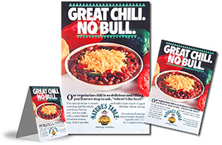 This campaign promoted vegetarian chile served by the Nature's Table Cafe® restaurant chain. Included advertising, poster and table cards. There are approximately 60 Nature’s Table Cafes® in seven states.