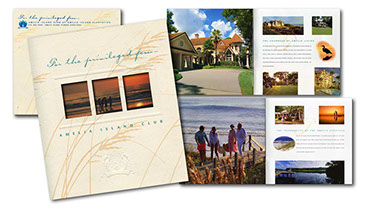 This brochure promotes membership benefits of the exclusive Amelia Island Club, including oceanfront and marsh front golf courses designed by Pete Dye, Bobby Weed and Tom Fazio.