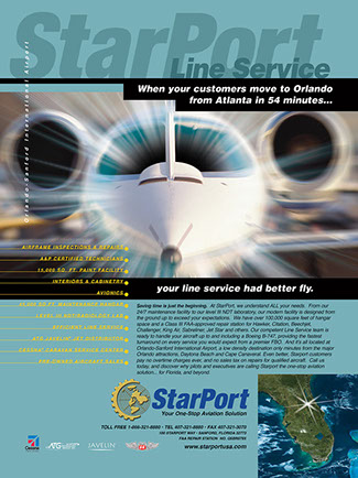 When we met with company executives, we learned that StarPort needed to inform the aviation market of how the company had expanded its business and services offered in order to meet the needs of aviation clients. The Company has a worldwide client base, but executives were concerned that pilots and others in the industry were not aware of their offerings. Our creative graphic design work for this client included an International ad campaign, informing its technically advanced target market of pilots and aircraft industry personnel that StarPort USA was now providing a full range of aircraft services and Class III FAA-approved repairs from a 100,000 sq ft. facility at the Orlando Sanford International Airport.